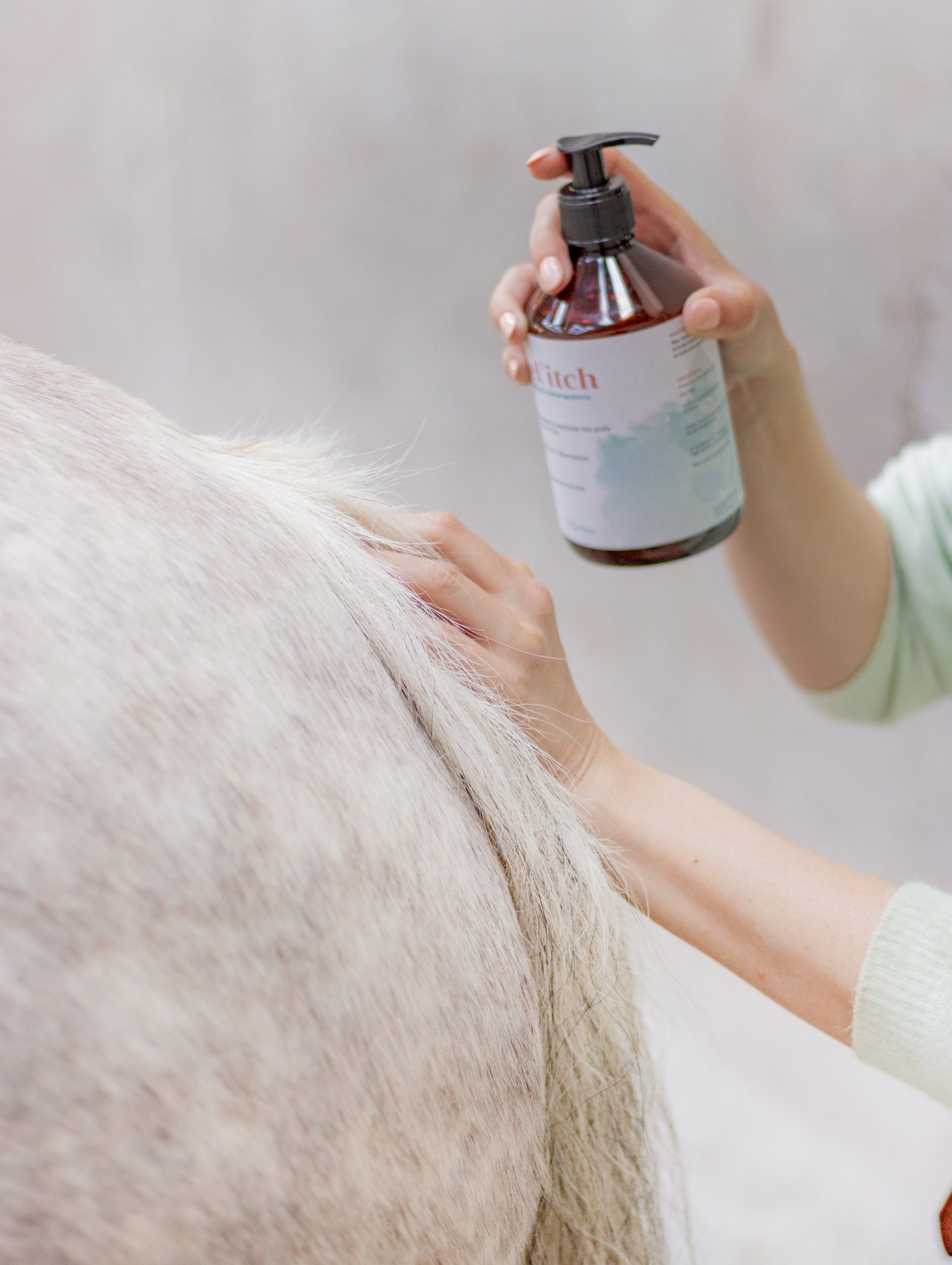 Appliquer une noisette de Bel’itch sur les zones concernées, directement sur la peau de votre cheval (zones grattées, irritées, sans poils).